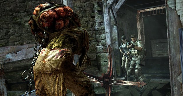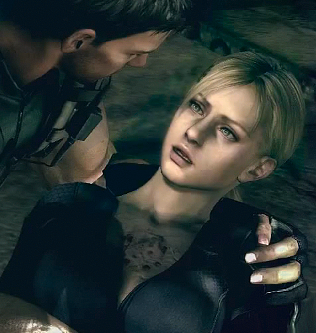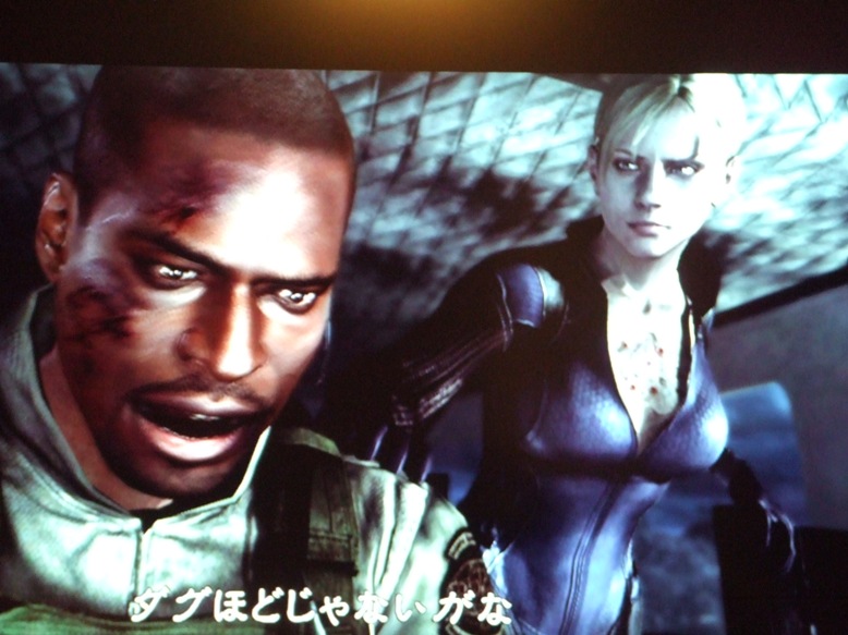 ジルに活を入れられウェスカーを追うクリスとシェバ